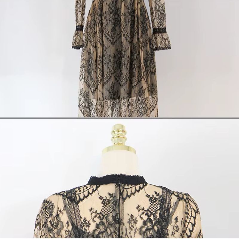 Cette robe vintage pour femme en dentelle suit les préceptes de la mode rétro et affiche un look unique, mêlant à la perfection la sensualité de la dentelle à la rigueur du jupon beige.